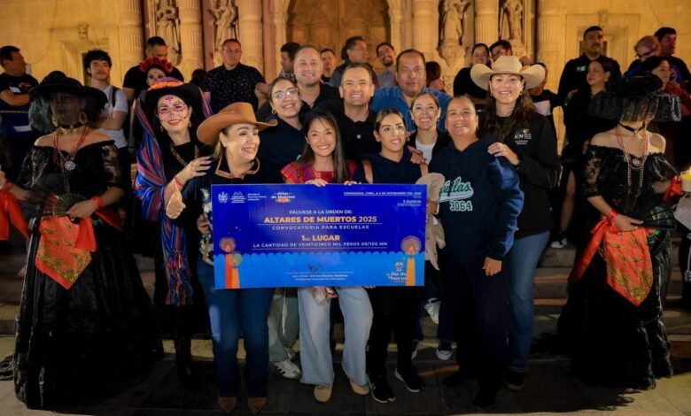 Como parte del festival por el Día de Muertos “El Regreso de las Ánimas”, el alcalde de Chihuahua, Marco Antonio Bonilla Mendoza, realizó la noche de ayer en la Plaza de Armas, la premiación a las escuelas ganadoras del concurso de altares de muertos 2025 en el que participaron escuelas de nivel básico, media superior y superior del municipio.